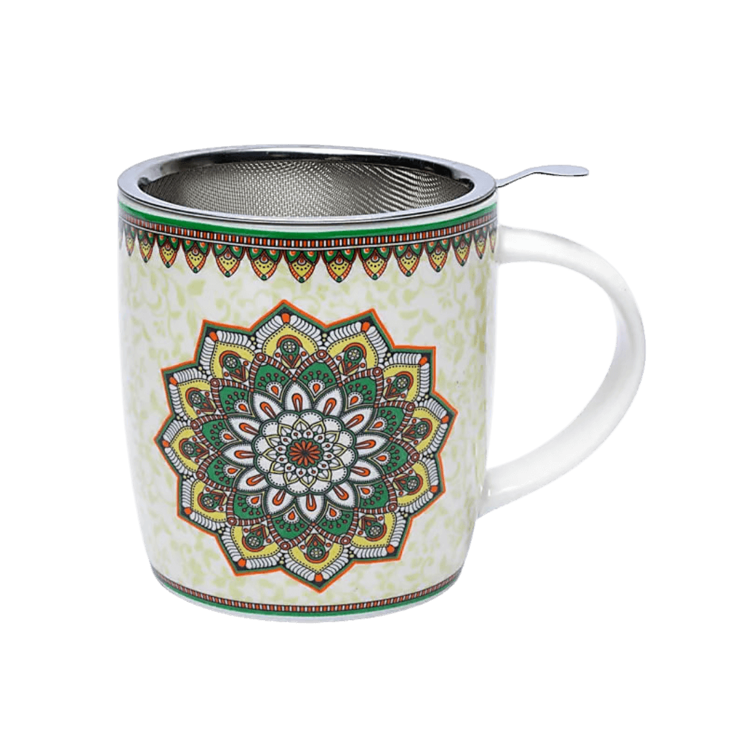 Dette krus til te er fremstillet i porcelæn af høj kvalitet og leveres med rustfri stål-infuser og låg. Du kan nemt brygge løs te direkte i kruset, og låget holder teen varm, mens den trækker. Glasuren har en smuk grøn tone, der varierer naturligt og giver hvert krus et unikt udtryk. Materialet er slidstærkt, tåler både mikroovn og opvaskemaskine og gør Te Krus – Mandala Grøn ideelt til daglig brug.